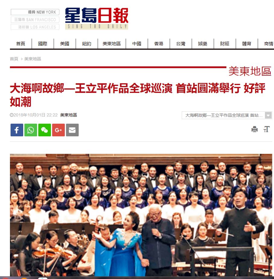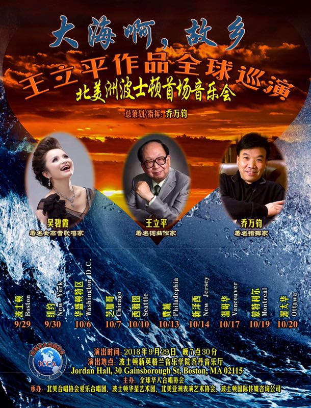由全球華人合唱協會和北美亞洲表演藝術協會主辦、著名指揮家喬萬鈞擔任總策劃的「大海啊故鄉—王立平作品全球巡演」,於9月29日晚在波士頓成功舉行了首場演出。可以容納千人的新英格蘭音樂學院喬丹音樂廳座無虛席,觀眾們向王立平老師的《大海啊故鄉》、《紅樓夢組曲》等經典作品致敬。