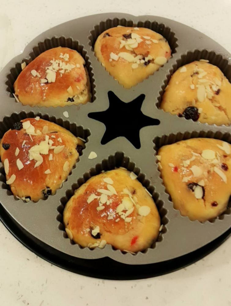 这款甜点需要特制的高深的模具。我没有,就用了Mini Panettone的方子, 有点象水果Muffin, 但成品要rich 许多,也好吃很多。
