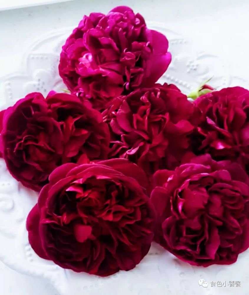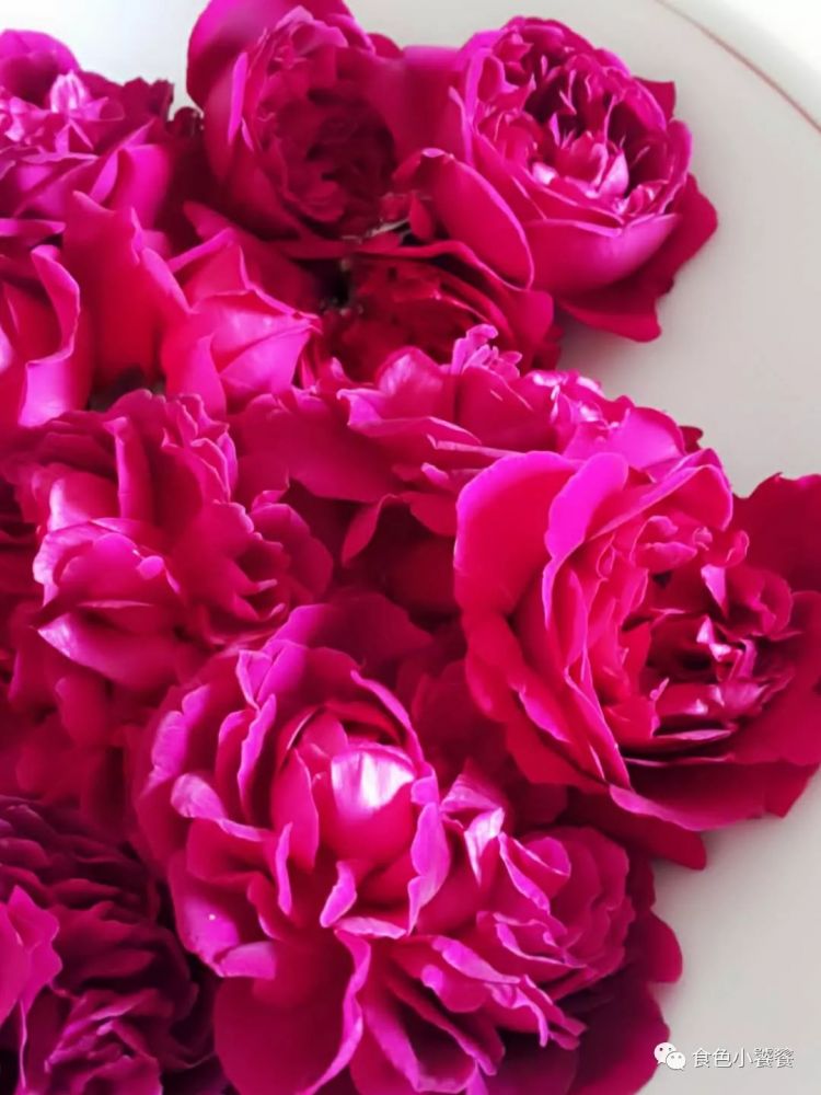 小饕选用了花园里的David Austin 红玫瑰 (莎士比亚2000), 这款玫瑰,如丝绒般雍容华贵,花色初放深红,后期转深紫红,具有浓烈的古典英国玫瑰的馥郁花香。大家可以选择任何花香浓郁的红色,紫红色系的玫瑰。或者买市售的玫瑰酱。