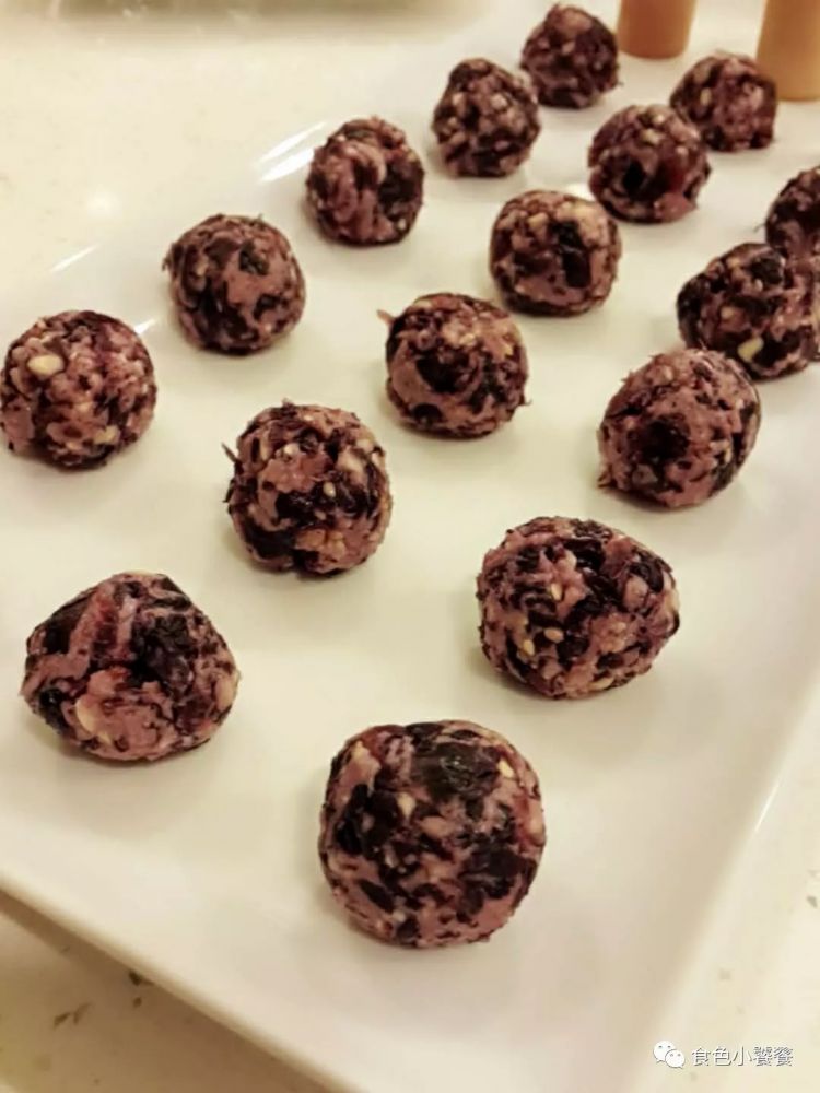 混合玫瑰酱,坚果碎,熟糯米粉,尝尝甜度,还可以再加少量糖。糅合成团,分成20克一个的馅料球。