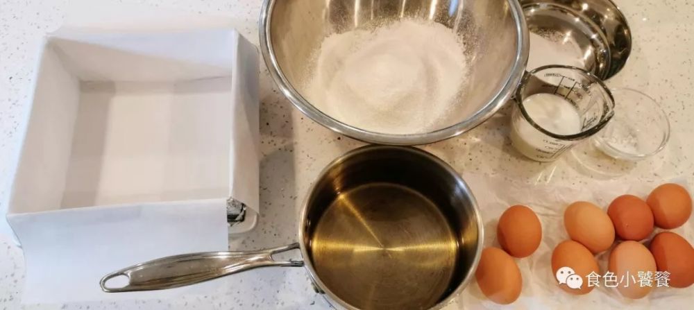 台湾古早蛋糕的烤盘比普通烤盘深,大约9厘米高。我的烤盘8X8X2英寸,太浅只有5厘米,于是我在四面加了12厘米高的纸板,并用铝箔纸包好。不包铝箔纸也可以,里面有烤纸垫着。