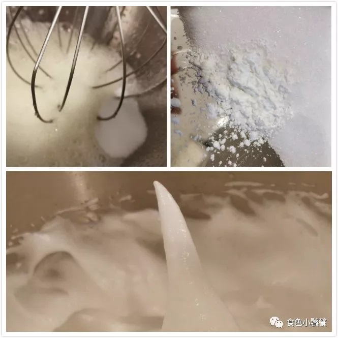 8个蛋白加入1克盐,打发到粗泡,加入一半糖,打发到细腻泡出现,加入剩下的一半糖和玉米淀粉,打到湿性发泡即可,即产生柔软尖角。宁湿勿干!