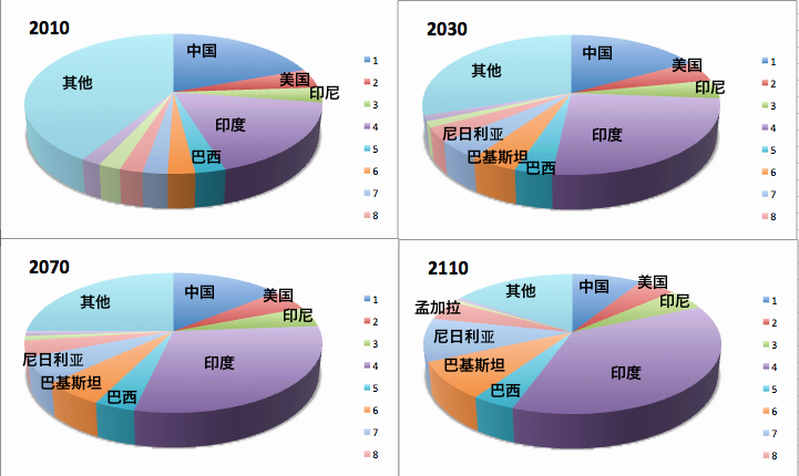 今后一百年世界人口的变化趋势已经基本确立。印度将占据并保持世界人口第一。中国先是退居二线,然后被尼日利亚超过成为人口大国的老三。欧洲人口缩减,非洲人口激增。