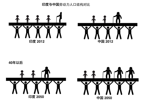 40年以后,印度每5个劳动力人口要养活2个小孩和1个老人,而中国每5个劳动力人口要养2个小孩和3个老人。
