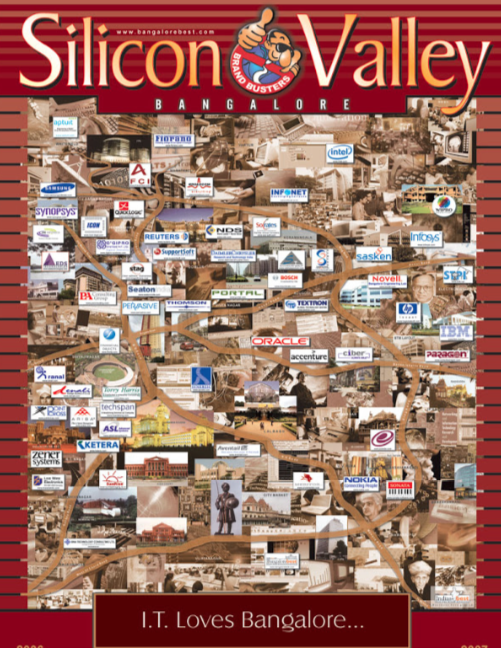 两个看点,一是班加罗尔已经发展成像硅谷那样以IT业为主的现代化软件工业基地。二是这几乎就是一张美国硅谷的镜像图[参考《印度崛起(一)的 硅谷图],因为几乎所有硅谷大公司都在班加罗尔设有相应的印度分公司,负责部分的软件研发。