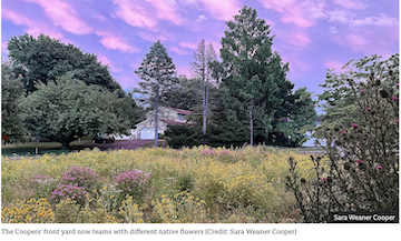 二是花草地【2】(上图)。这里展示的是库珀夫妇在宾夕法尼亚州购买他们的第一套房子时, 把草坪变成花草地的照片。 这些花草都是当地植物。他们用了两年的时间,终于让齐腰高的本地植物品种覆盖了他们前草坪。
