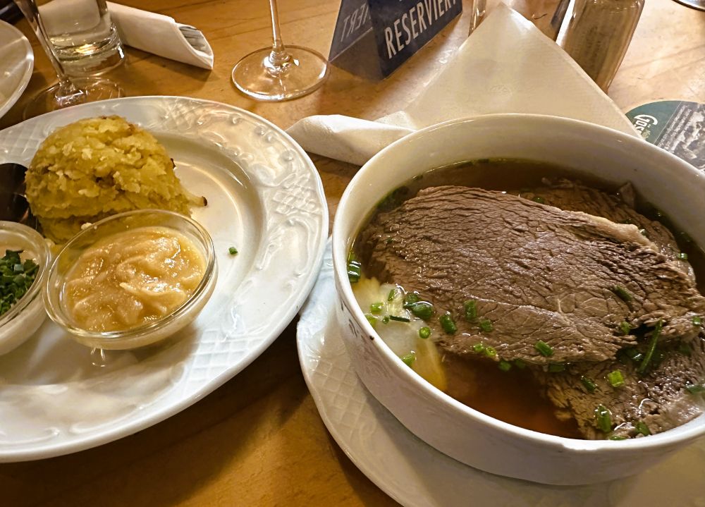 看到介绍维也纳该品尝的食物:维也纳炸猪排Wiener Schnitzel;维也纳香肠Wiener Wurstchen;烤乳酪Leberkase;煎蛋汤Frittatensuppe;维也纳炖牛肉Viennese Goulash;塔菲尔斯皮茨Tafelspitz。其中炸猪排,香肠,炖牛肉已吃到怕(天天大肉,你试试),烤乳酪和煎蛋汤尝不尝无所谓。倒是想尝一下曾是皇室专属菜肴,也是奥地利皇帝约瑟夫一世最喜欢的,有“皇帝的菜肴”之称的Tafelspitz 。去一家好餐馆,没定位,让我们和一位来自意大利撒丁岛的老先生拼桌。老先生的菜先到,他尝了口:不错。嗯,意大利人说不错应该不错。确实,牛肉汤没放香料,炖得清清爽爽,喝得出鲜味。