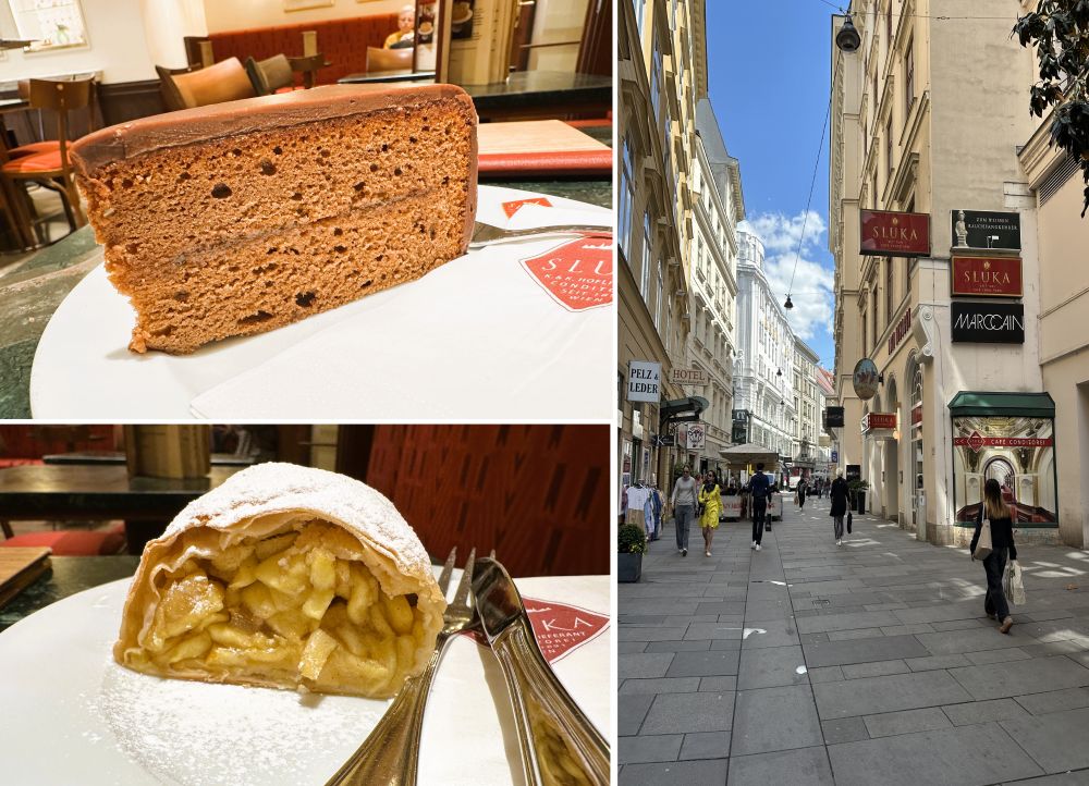 多层巧克力萨赫蛋糕(Sachertorte)和苹果卷(Apfelstrudel)(奥地利,德国巴伐利亚,捷克,意大利北部,斯洛文尼亚,克罗地亚和曾经奥匈帝国的流行糕点)是维也纳两种推荐甜点。进一家百年老店品尝,打算若好就买点带回送邻居,很遗憾,不好(很可能是我没甜齿对甜点挑剔的缘故)。