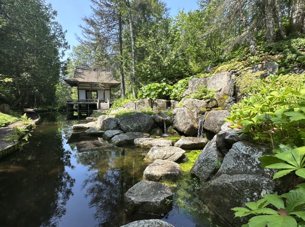 * 今天又是炎炎夏日,一起赴朋友的好朋友也是我们的朋友当义务导游的私家花园参观。 去的车上导游朋友开始介绍:18世纪主人领地有200平方公里,一代代传下,终于不够资金付税和维护,土地一块块卖掉,1928年建的豪宅火灾后重建。传到五十年代,女主人在美国金融界发大财的丈夫得抑郁症,回来修养,开始修花园。历经几十年,现在的花园占地3平方公里。八十年代魁北克生态组织上门求赞助,主人说:我不给你们钱,但是我的花园可以每年对公众开放几天,由你们找志愿者当导游(朋友就是在这个组织当志愿者),收入归你们。自此花园每年夏天对公众开放4个周六,共 2500名参观者。朋友说每年的门票在45分钟内抢空。4个对公众开放的周六外,另有6天每天开放4-6组4人私人团给志愿者的朋友或熟人或家人。我们正巧碰上私人团的其中的一天,美好的5人一日游。2小时的导观结束,圣劳伦斯河边坐下野餐。朋友,美食,美景,不能要求更多。