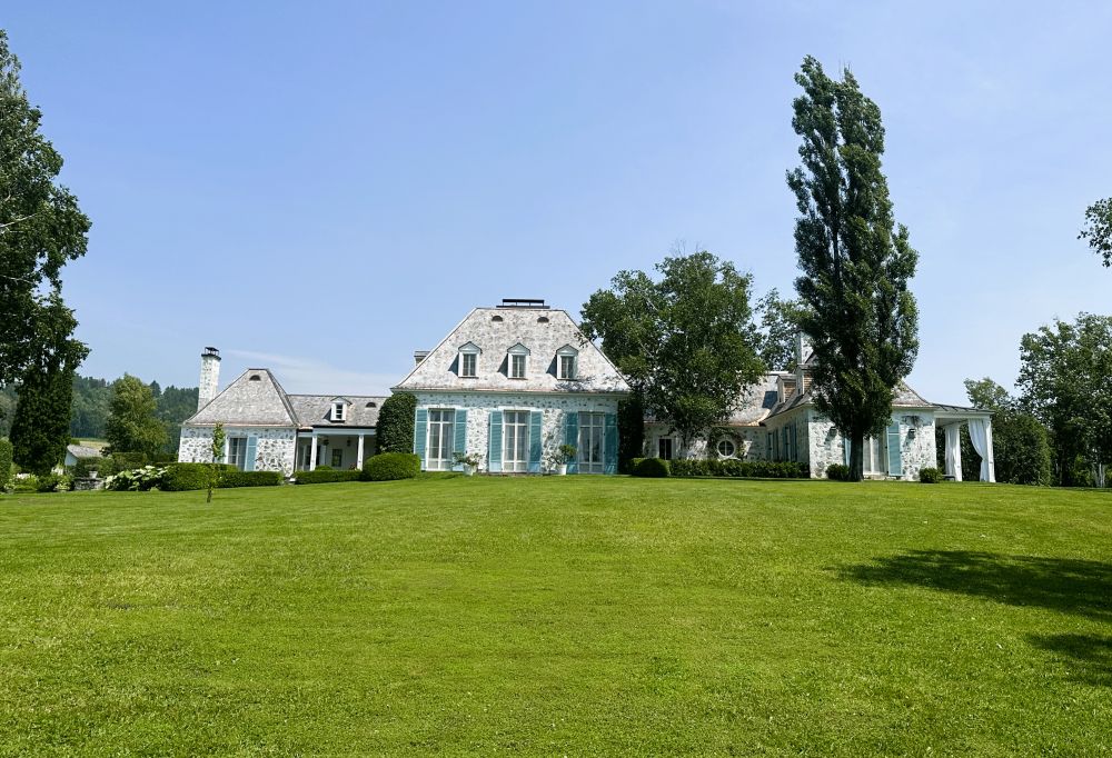 7)现主人(女主人爱骑马,我们参观那天看到有人在给马“洗澡”)每年夏天来此住4个月,其余时间住纽约或全世界旅游。屋子这一面面对圣劳伦斯河及河对岸群山,左侧面对长长的绿毯(草坪)两行树及远处群山,右侧面对蔬菜花果园。花园走到哪都能听到哗哗水声(人工修建的水渠,引水道,非常静谧治愈,想来对当年患抑郁症的男主人起到很大的治愈作用)。