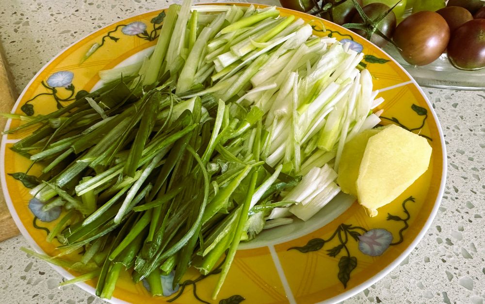 2)一把葱,葱白葱绿切段切丝,分开放;切3片姜;(可以切1个小葱头,即紫色小洋葱)