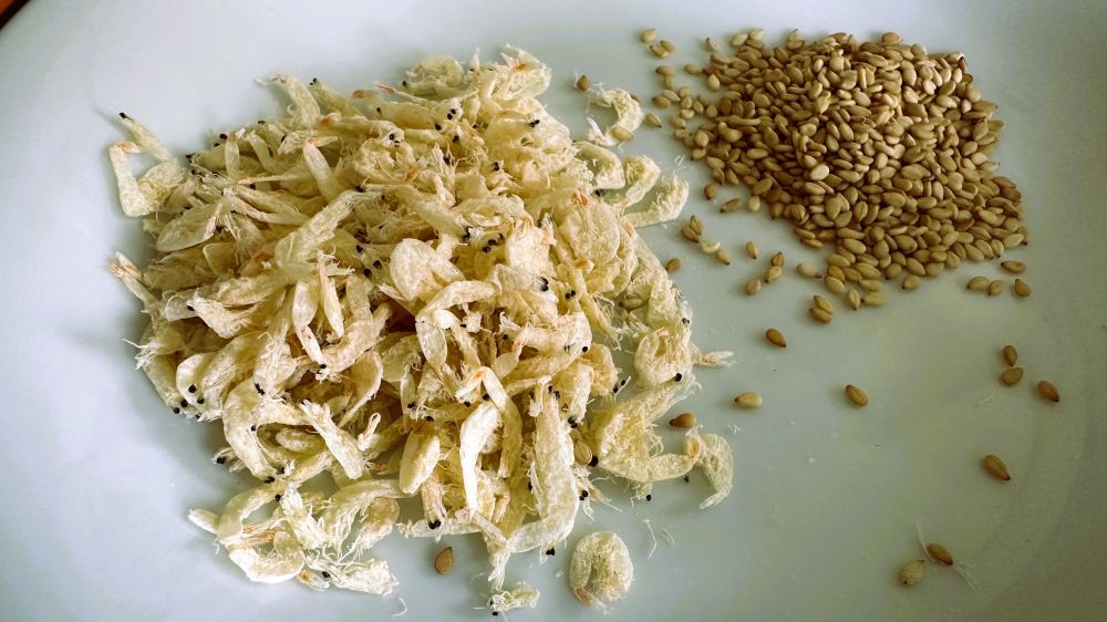 3)一点开洋(虾米),用花雕泡开,洗净,厨纸吸干水(家里没有开洋,我用虾皮替代,还行);一点芝麻(机动)