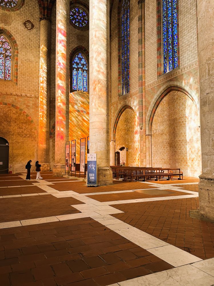 7)图卢兹Jacobins Convent上午阳光透过玫瑰花窗折射在柱子和墙上非常漂亮。