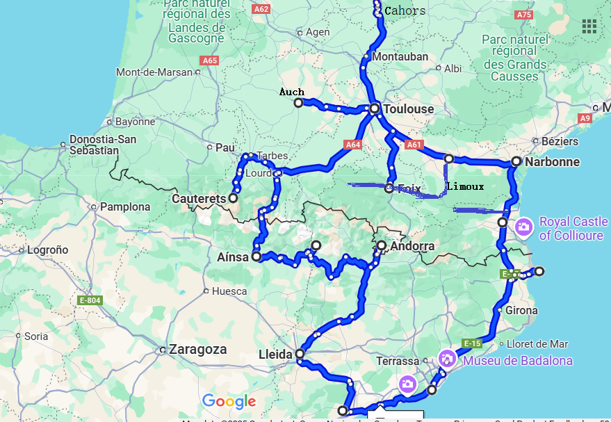 D27, →Limoux*(87.6Km/1H4’),3H;1.5pm→Mirepoix*(33Km/37’)3.5pm→Foix*(35.4Km/33’)住4夜;第1夜
