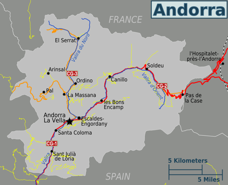 安道尔共和国坐落于西班牙和法国间比利牛斯山脉中,用欧元,官方语加泰罗尼亚语(Catalan),不属欧盟也不属申根区,入境不需签证,自驾一般不需出示护照(偶尔会)。汽油价格低于法国和西班牙。首都Andorra la Vella 是欧洲海拔最高的首都(1023米),分新老两区。新城是商业区,老城建于十一世纪,罗马式建筑。