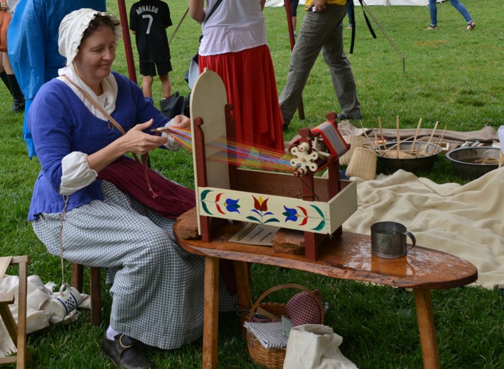 前面的草地还有人穿了那个时代的衣服在纺纱,还有的做点心,展示当时的武器。吸引了路人驻足观看。
