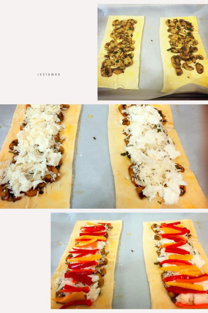puff pastry sheet方在parchment paper上,一切二。然后涂上蛋液。