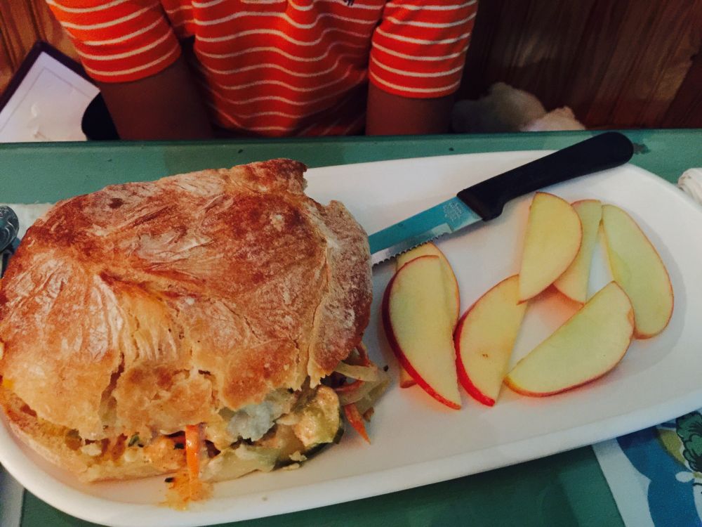 店里的东西据说都是当地农场买的新鲜菜,但是我们自己平时吃的也是当地农场买的,所以没有觉得有很大的区别。唯一觉得特别的就是他家的烤猪肉作了特别好吃。缺点就是太多了。我只吃了一块就饱了。剩下的都给了老公。