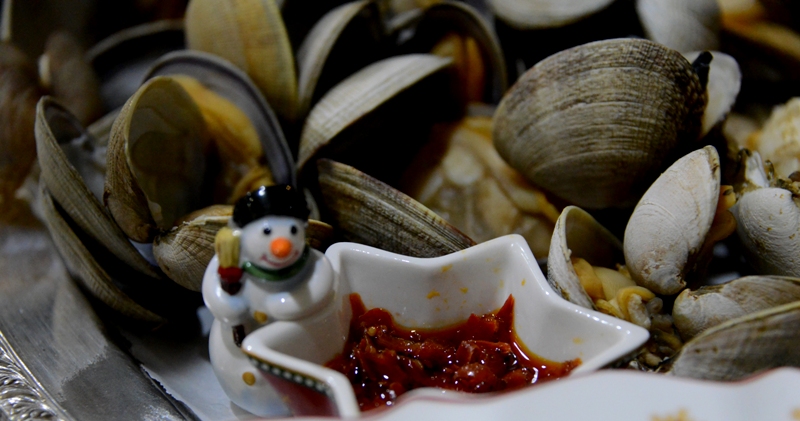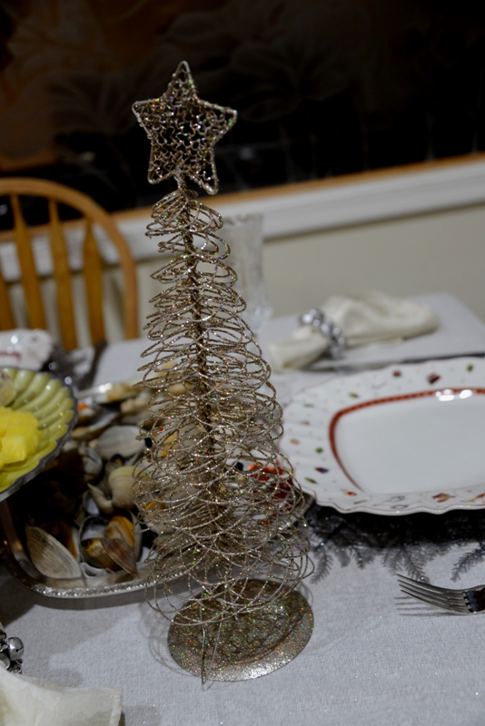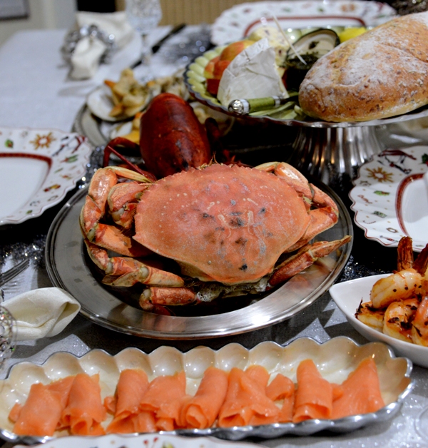 法国圣诞节和去年的意大利有点相似,以海鲜为主,龙虾,鱼子酱,烟熏三文鱼。但是没有买到好的牡蛎,所以用蛤蜊代替了。我本人不喜欢吃鹅肝和蜗牛,于是用了大蟹代替。餐台全是以银色为主。因为是小朋友学校上课日,不能搞得很晚。所以没有很铺张的大搞。