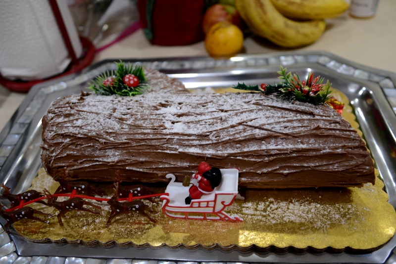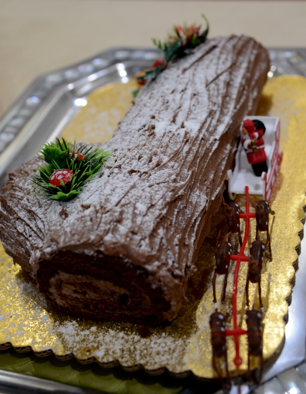 还要有个芝士果盘,,饭后的甜点就是法国著名的Buche de Noel. 也就是yule log.这个蛋糕做成树桩的形状,背后还有个历史小故事,据说拿破仑的时候,冬季为了防止病菌传染,拿破仑就叫大家把烟囱关上,这个时候这个蛋糕发明了,代表了家庭聚会.还有说这个蛋糕最早是古塞尔特人的冬至传统.在这个最短白天的冬至日,塞尔特人用橡木,樱桃木,榆木或者榉木的任何一个大树桩,用来烧火,作为太阳重生的象征.后来慢慢演变成用树桩形状的蛋糕来庆祝招待客人了.树桩蛋糕主要是糖分,蘑菇还有莓子来装饰.但是我们就用了放了去年买的留下的圣诞老人和小鹿.