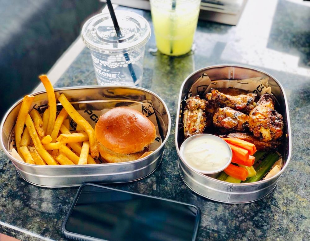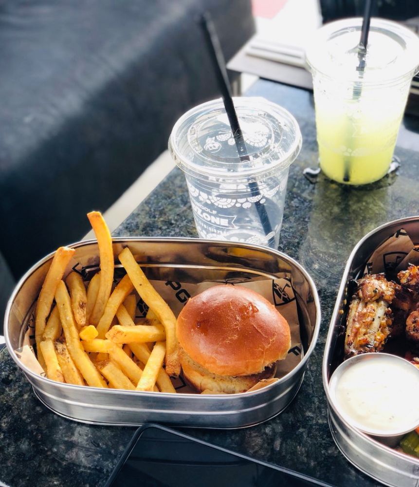 里面供应的都是酒吧食物,flatbread,鸡翅,汉堡什么的。小孩子都爱吃。我因为要开长途就没喝酒。打是按小时计算,一般人少,两个小时就够了,大约能打63个球。太长容易累。尽管说说是室内,电风扇再怎么吹,还是热的。两个小时后,我们打道回府。路上两个小的吵了说饿了,难道刚才那些汉堡鸡翅都喂了小狗不成。说要吃火锅,前两天刚刚吃过好不好,就是要吃,女儿还说,吃完火锅要吃对面的冰激凌点的rolled ice cream. I knew it!