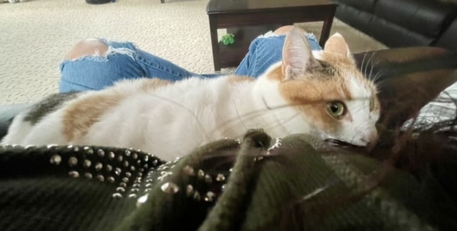 我多是一个被动的人,不太会主动出击。这几天跟猫猫越混越熟,我也敢抓她入怀了,尤其之前她对我的磨蹭我明白了她是在对我示爱。今天,我胆大地抱她入怀,她竟然顺势仰躺在我怀中,我惊喜,抱着她走近沙发、坐上了沙发。原来,该出手时就要出手啊。