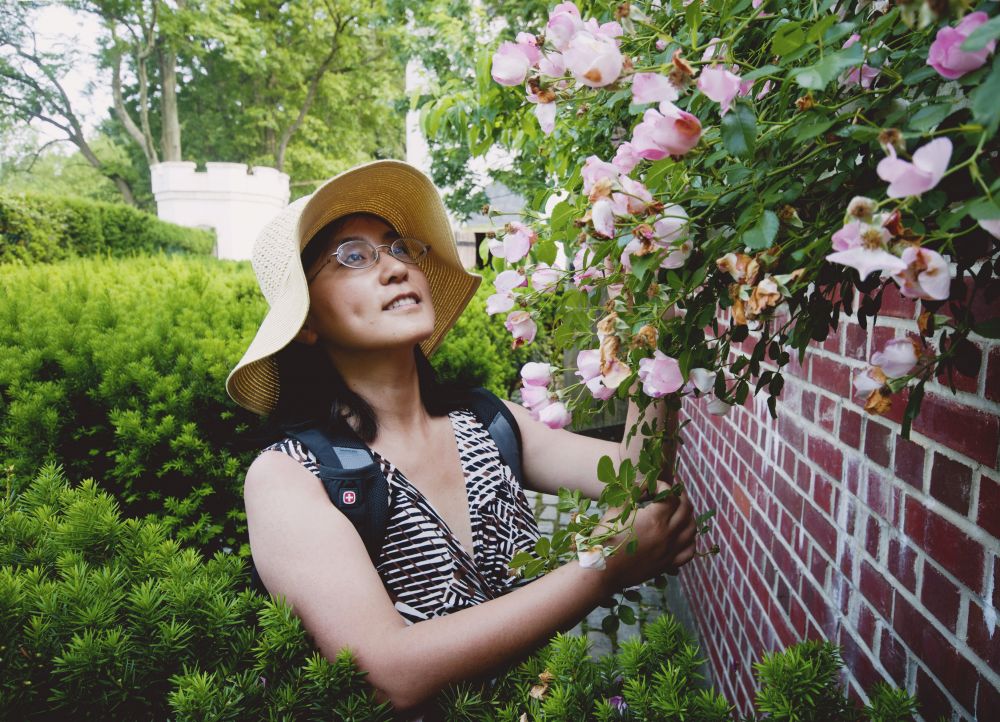 第二张照片, 是我们家和高中老同学一家见面的时候抓拍的。 当时花园里很安静, 几个孩子跑在前面,我可以欣赏一下那些美丽的花。