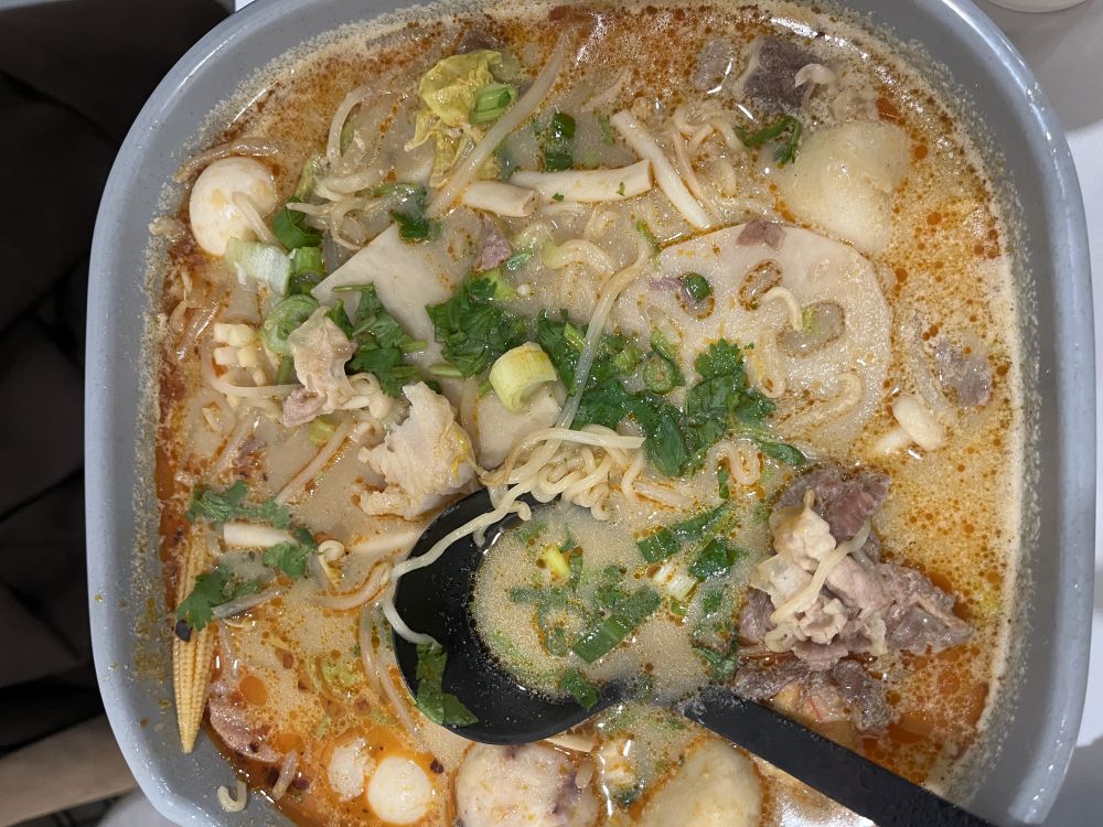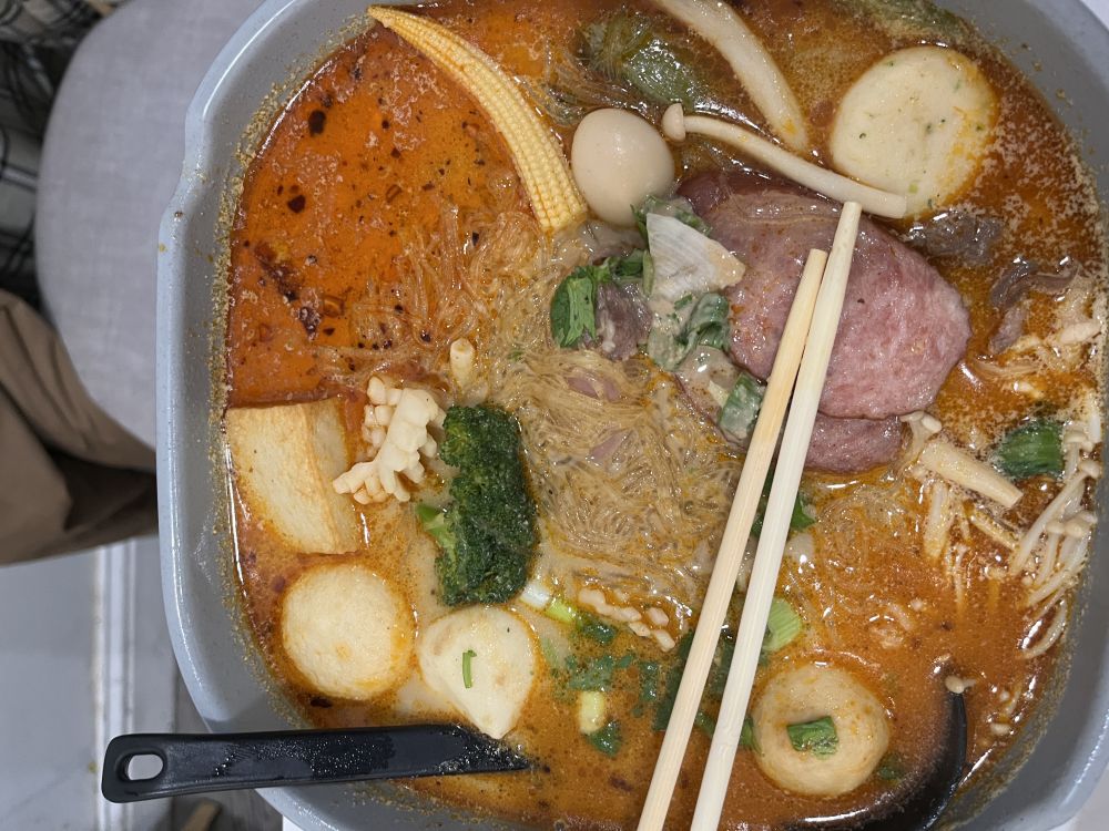 女儿知道我喜欢吃麻辣烫,就在我家附近的杨国福麻辣烫吃了一顿。因为我这个星期给公司oncall,不能走太远,我背着我的笔记本电脑进了餐馆。女儿很饿,竟然盛了两磅多的食料。LOL