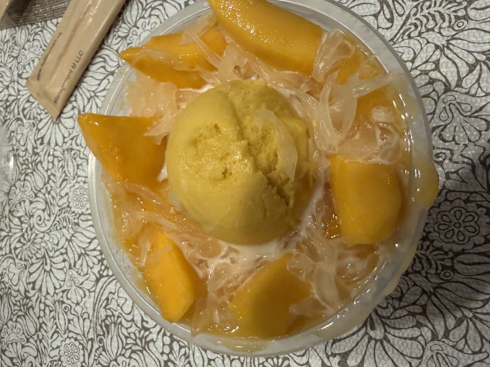 吃完我们都说太饱了,但是女儿和女婿还是要吃甜点,于是走到了另一家店,人很多没有座位,就把甜点带回家吃。