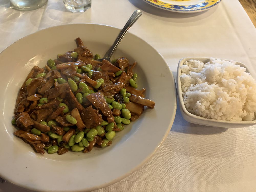 看了两个小时以后就饿了,博物馆里的食物又不好吃又贵,正好隔壁是一家中餐馆,里面没有什么人,米饭很一般,炒菜还不错,也没有很咸。是一个烤麸油焖笋和青豆,味道超出预期。