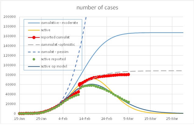 图1:累计病例与每日现有病例与模型之比较;模型取中性和悲乐观三种趋势,公布数据明显沿乐观预测发展。个人分析,这种乐观形势应主要归之于中国采取的强力隔离措施。在模型里,这主要体现在干扰传染强度的半衰期 (tao-1) 上,乐观取值为 6 或 7 天,中性和悲观取值分别为 10 和 14 天。