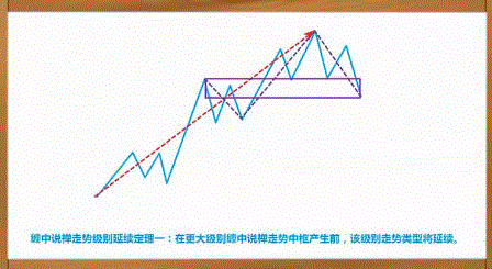 缠中说禅走势级别延续定理一:在更大级别缠中说禅走势中枢产生前,该级别走势类型将延续。也就是说,只能是具有该级别缠中说禅走势中枢的盘整或趋势的延续。