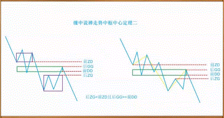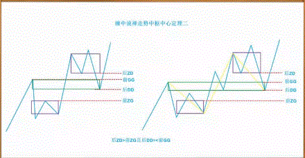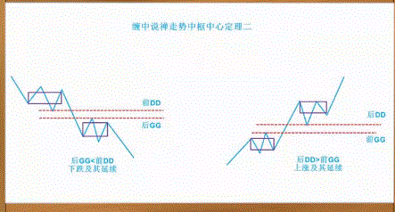 缠中说禅走势中枢中心定理二:前后同级别的两个缠中说禅走势中枢,后GG<前DD等价于下跌及其延续;后DD>前GG等价于上涨及其延续。后ZG<前ZD且后GG>=前DD,或后ZD>前ZG且后DD=<前GG,则等价于形成高级别的走势中枢。