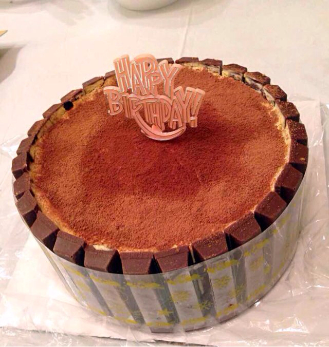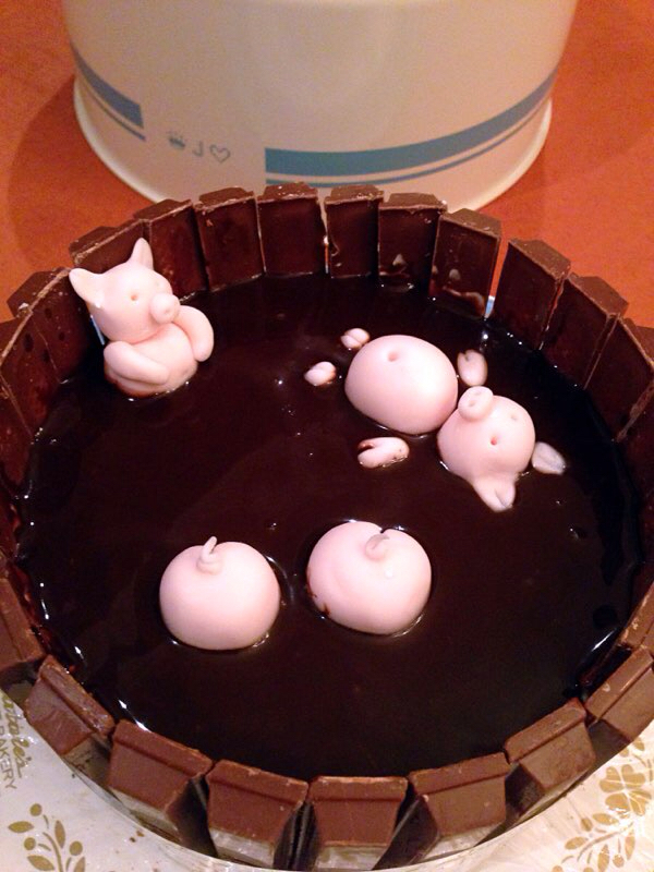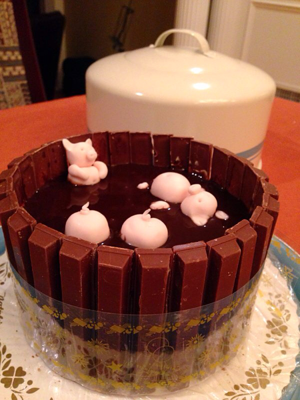 按朋友给方子周末自己做了mascarpone cheese,然后又做了提拉米苏,蛋糕部分舍弃了店里卖的lady fingers蛋糕,用了自己烤的百利甜酒戚风,外围用了Kit Kat饼干。在网上看到过这个小猪泡澡的造型,一直想试试,星期天下午和小猪一起做手工