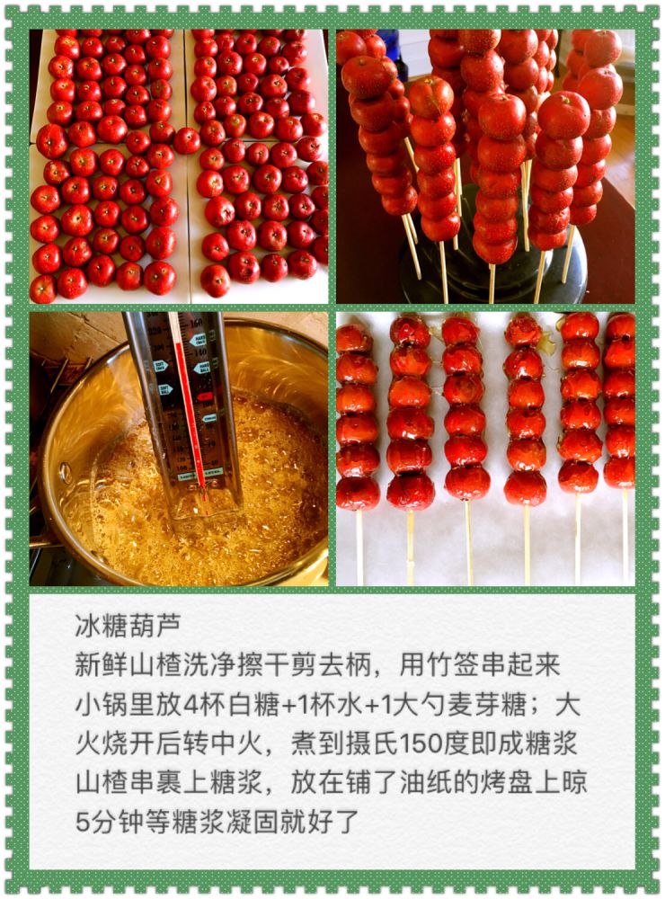 按北京闺蜜的建议换了冰糖熬,按米国闺蜜的建议晾的时候在纸上往下拉几厘米(北京冰糖葫芦摊上偷师的技巧)俺终于做成了顶上有糖片的冰糖葫芦