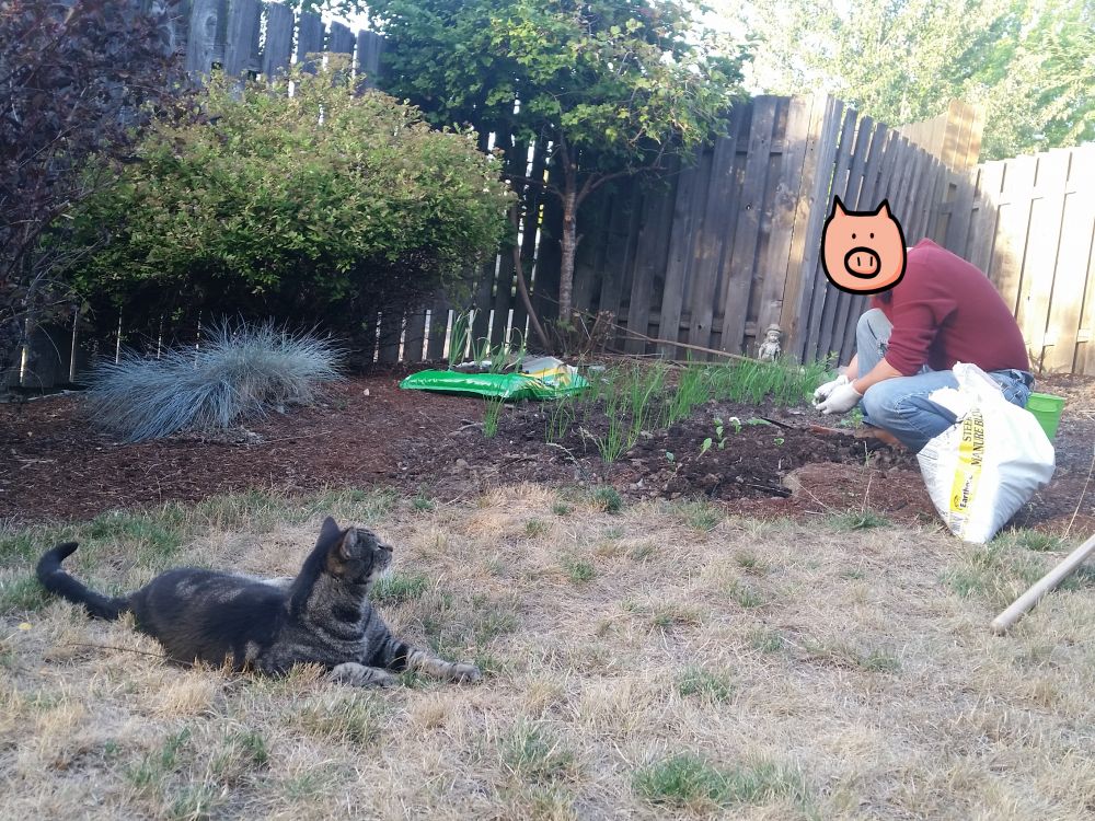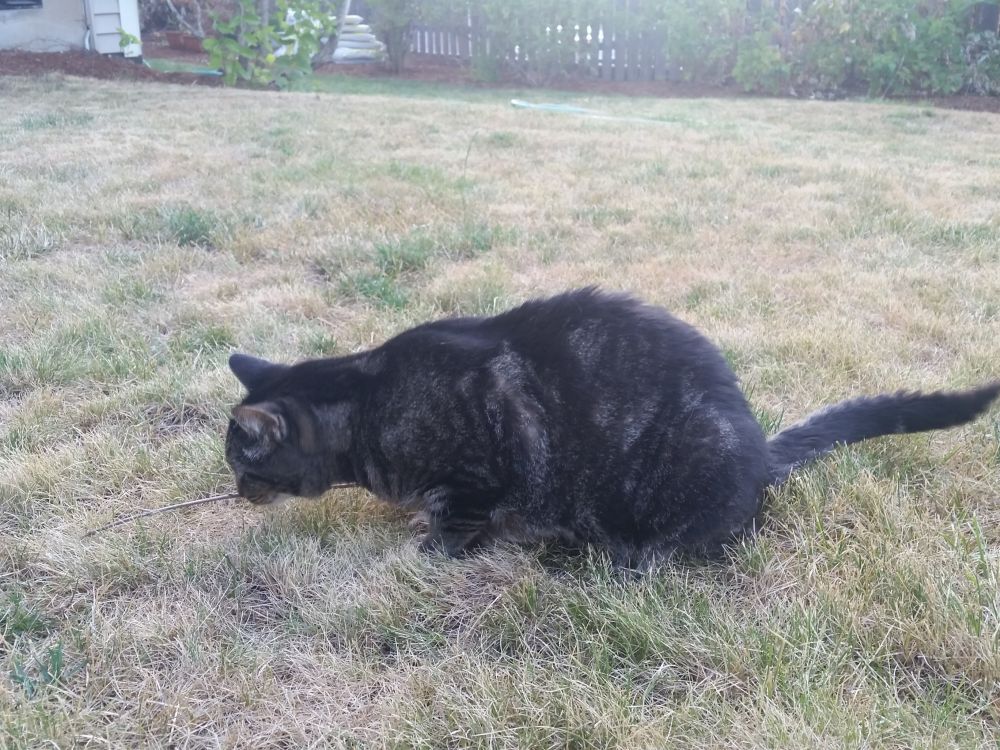 从此之后,小猫咪就成了我们家的一员。每天早晨起来,大灰狼要做的第一件事情就是检查小猫咪是否在外边等着他,然后给小家伙吃饱喝足了。如果赶上周末,大灰狼起来晚了,小猫咪便会知趣的先出去玩一会儿,等到大灰狼起来之后吃个brunch。每天晚上下班后到家后,小猫咪都会从什么地方跑过来迎接大灰狼。车库的门打开后,小猫咪便跟了进来,往地上一滚,像个小无赖一样躺着,直到看见食物才肯起来。待到大灰狼吃饱了饭到后院去干活,或者乘凉,小猫咪便跟在后边,要么像个守护着一样趴在那里,要么就和大灰狼有一搭无一搭的聊天。我们家的后院也经常发现死老鼠,鸟毛之类的东西,估计都是这小家伙的杰作。有一天,我在吃饭,小家伙吃饱喝足在那里打盹。忽然小家伙像剑一样的冲到了一颗大树的底下,紧接着就看见一只松鼠拼命的逃到了树上。 如果我们出去散步,小猫咪经常会在我们回来的路上等着我们。如果哪一天没有见到小家伙,大灰狼便会喵喵两声,小猫咪便会顺着声音寻过来。我们平时吃鱼吃肉,也都要给小猫咪单独的煮份没有盐的。最有意思的是小猫不喜欢吃生的三文鱼,想起人们常说哪有不偷腥的猫,真是不可信。
