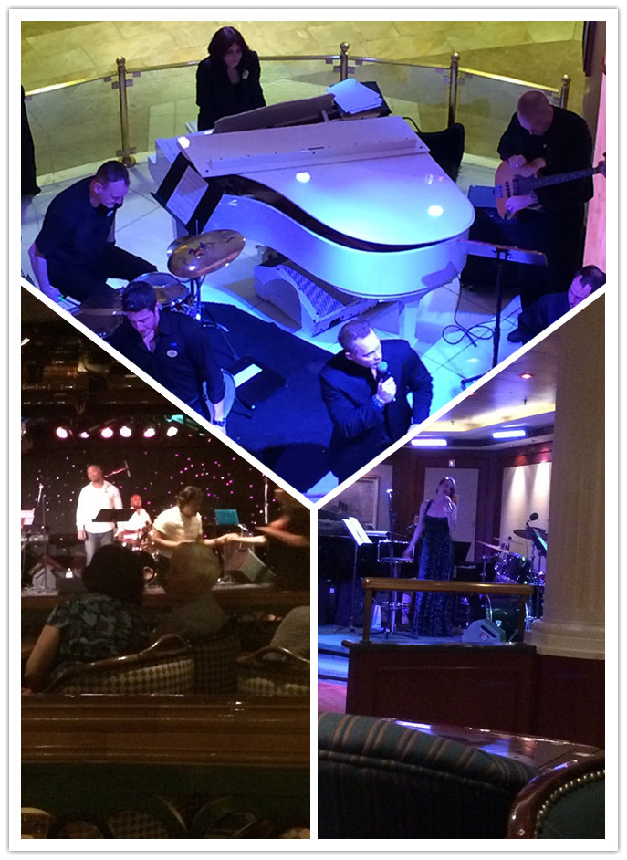要是喜欢玩游戏,玩赌博,有sudoku, bridge, 一起去玩,casino 可以去光顾。天天有电影放映,室内的室外的都有。喜欢安静的,有图书馆可以借书,找个临窗的椅子,安安静静的读本好书,抬眼可以望望海上的美景。喜欢看景的,到甲板上随意走走,让海风吹吹,举起相机,记录美景。喜欢艺术的,到画廊转转,还有艺术品拍卖会可以参加。夜晚的生活更是浪漫,酒吧,night club,小型音乐演奏,随处都有。