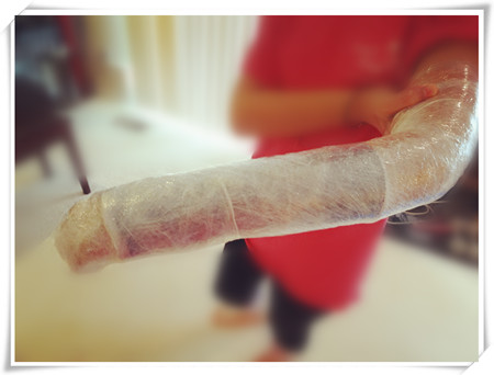 照片是姐姐胳膊上裹上保鲜膜去洗澡,这样cast就不会被湿到。