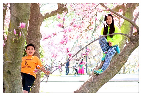 玉兰丛中俩精灵