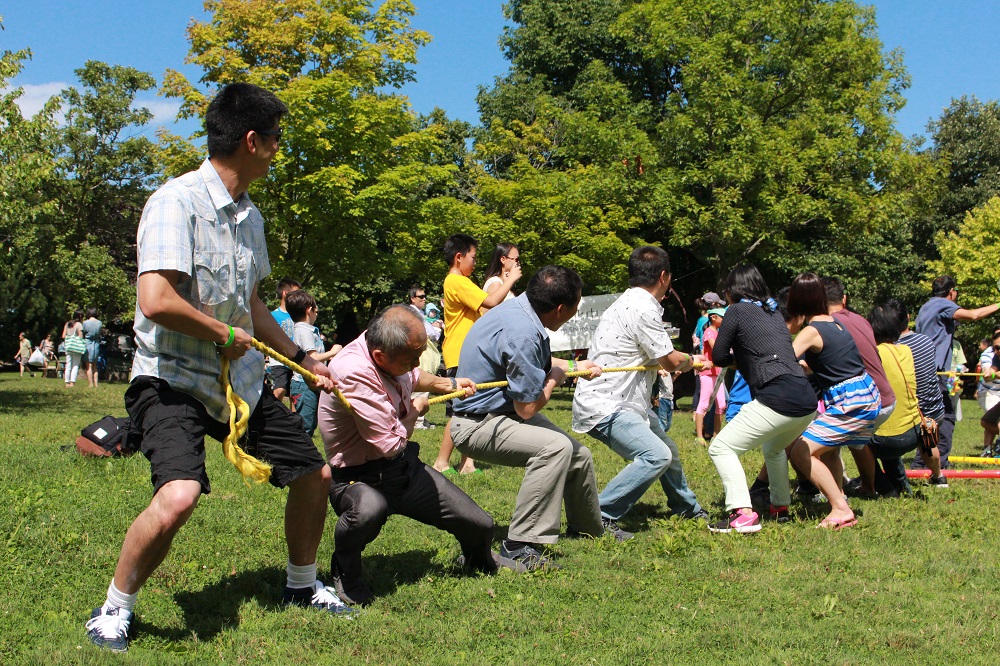 老老少少男男女女分别加入拔河队伍,一派热闹景象