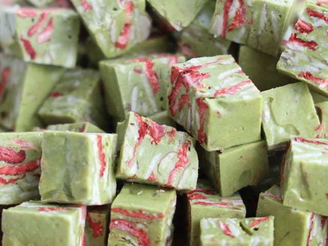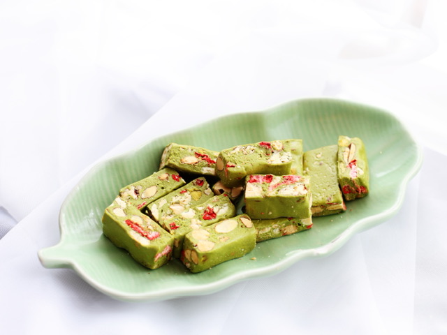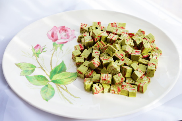 草莓抹茶杏仁 牛轧糖, 我切成bite size, 一口一个,没加糖,健康 低卡