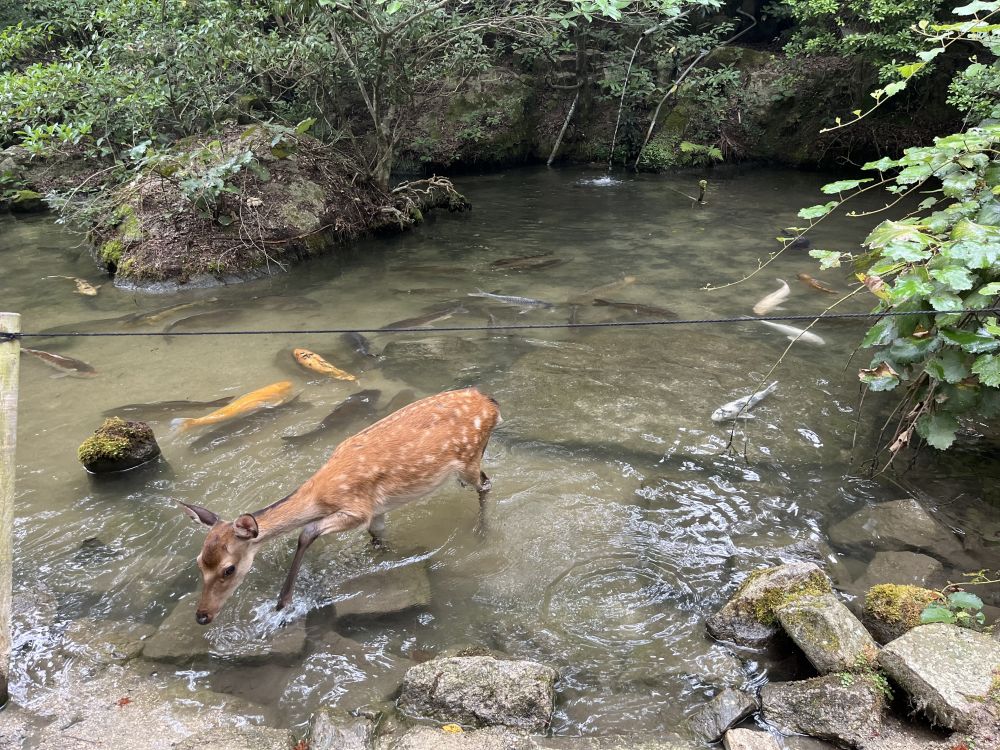 第二天我们乘渡轮去了广岛旁边的一个岛屿——宫岛,宫岛是日本著名的景点,被誉为日本三景之一, 是集宗教、自然景观和资源以及特色商业为一体的休闲娱乐的地方。宫岛最具代表性的景点就是建于海上的神社,神社的红色大鸟居在涨潮的时候仿佛漂浮在海面上。宫岛还是生蚝和鳗鱼的养殖基地。远看宫岛就像躺在海上的弥勒佛,有点像乐山大佛。导游带我们在附近参观后,由我们自行活动。我选了一家餐馆解决午餐,我点了鳗鱼饭和炭烤生蚝,生蚝特别新鲜,我又多加了一份,你要是在的话,肯定吃得特别的香甜。饭后我和来自澳大利亚的彼特,印度裔加拿大人柯维塔,还有瑞典的傅西亚一起去爬山。宫岛上的弥山风景优美,植被森郁,还有时不时出没的梅花鹿,梅花鹿不怕人,你可以轻轻地触摸它。我们一行四人向着山顶攀爬,开始路还好走,到了半山腰的时候,路开始陡峭,石梯开始不规则,有的梯坎一步非常高,要很费力才能踏上去。好在我好像还没有老到爬不动,除了傅西亚年轻一点外,我们其他三人年龄都差不多,但都是老当益壮,一点都不喊累。一路上山林层叠如画,空气清新,虽然汗水打湿了衣衫,我却感觉特别的痛快舒服。我记得我们读书的时候也有好几次一起去爬山,你还自称是登山队队长,那个时候我们精力充沛,生龙活虎,好像不知道以后生活的艰辛曲折。好不容易我们到达了山顶,但是我的大腿肌肉开始抽筋,无法再步行了,柯维塔决定陪我坐缆车下山,彼特和傅西亚继续步行返回。缆车穿行于郁郁葱葱的原始森林之间,山林的景色令人陶醉,满眼是苍翠欲滴的密林和蒸腾的云海,远处泛着银光的海面上波光粼粼,岛屿点缀其间。严岛神社的大鸟居在海中默默矗立,它半掩在海水中,守护着这静静的山林湖海。