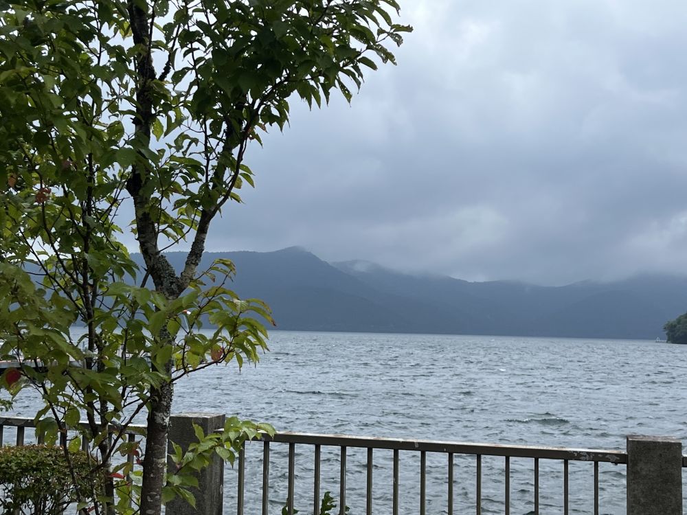 从京都乘新干线子弹头列车来到箱根,箱根的天气比京都凉爽了很多。在箱根的芦湖,我们乘坐海盗船游览,湖面平静如镜,湖边山峦叠翠,站在船边的栏杆旁,迎面吹过来带着山林清香的微风,眼前展开的是一幅由水、山、天共同构成的宏伟画卷。当天天气比较阴郁,雾气轻笼湖面,仿佛漂浮在仙境之间。放眼望去,山影模糊,湖水碧绿,如同一幅水墨画。船抵达对岸后,我们在那里乘坐缆车到达箱根最高处——大涌谷。大涌谷是箱根最具震撼力的自然景观,它是3000年前火山喷发后形成的火山遗迹,至今地面活动仍然频繁,地面冒着白烟,空气中弥漫着硫磺的气味。因为这样的地热活动,整个大涌谷都置身于烟雾缭绕之中,再加上山顶风大,让你体会到巨大的视觉和感觉的冲击。因为当天风特别大,导游临时通知我们提前坐缆车下山,他可能怕有人被风吹倒 ,引起不必要的麻烦,或者是风太大缆车会因为安全问题被取消。坐上缆车,离开雾气蒸腾的山顶,随着缆车的下滑,我们逐渐被山林包围,层层叠叠的针叶树和阔叶树交错并植,构成茂密的森林。橡树、枫树、山毛榉树的树群编织成了一片片浓绿的天幕,排列整齐的杉树与扁柏人工林,高耸笔直,像绿色的箭矢指向天空。这一带空气清冽,风声在林间穿梭,缆车在其上掠过,宛如在森林之上的空中漫步。再往下,森林变得低矮,林中出行大片的竹林和蕨类植物,山腰中可以看到若隐若现的屋顶和弯弯曲曲的小路。从缆车出来,我们很快来到预定好的温泉宾馆。