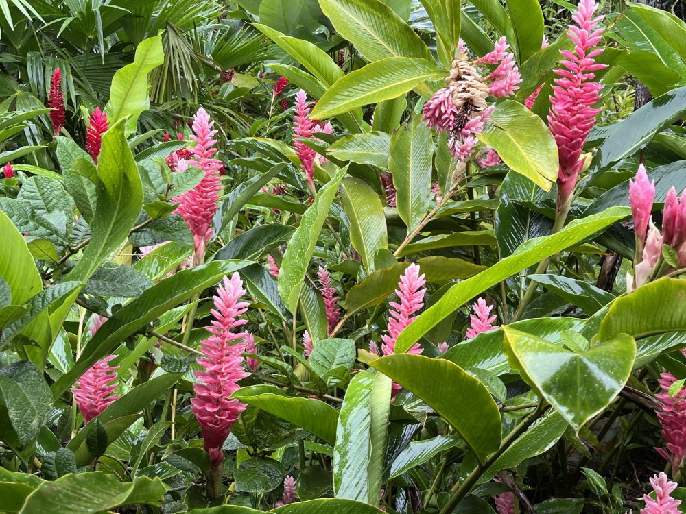 在伯利兹我参观了一个香料植物园。我之所以对植物感兴趣是因为我有植物学的背景,我走哪里都喜欢观察当地的植物。有一本书叫《50 Plants That Changed the World》,这本书讲了香料植物如何推动大航海、殖民与战争,咖啡馆如何影响启蒙运动,以及可可如何从中美洲宗教饮品变成全球工业商品。香料园门口迎接我们的是郁郁葱葱的热带植物和花卉。红苞花(Justicia carnea)像瀑布一样从墙上倾泻下来,好像要用它的热烈来迎接远到的客人。鹦鹉蕉(Heliconia rostrata)香蕉叶般的大叶子伫立在小路旁显得亭亭玉立,猩红的花序像鸟喙一样从茎叶中抽出来有一种惊艳的雕塑感。红姜花(Red Ginger)一片片粉红色松果形的花序在光泽墨绿的叶片中,如同被雨水抚摸过的火焰,湿润而繁盛。