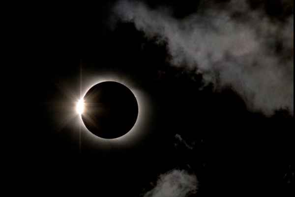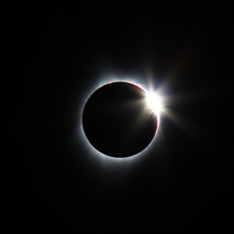 今天的日全食,最引人瞩目的当属“钻石环效应”(Diamond Ring Effect)了。当太阳掠过月亮,月亮坑坑洼洼的表面漏出一粒光,即形成了硕大的钻石环: