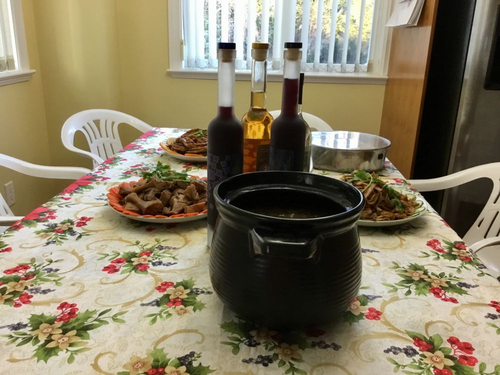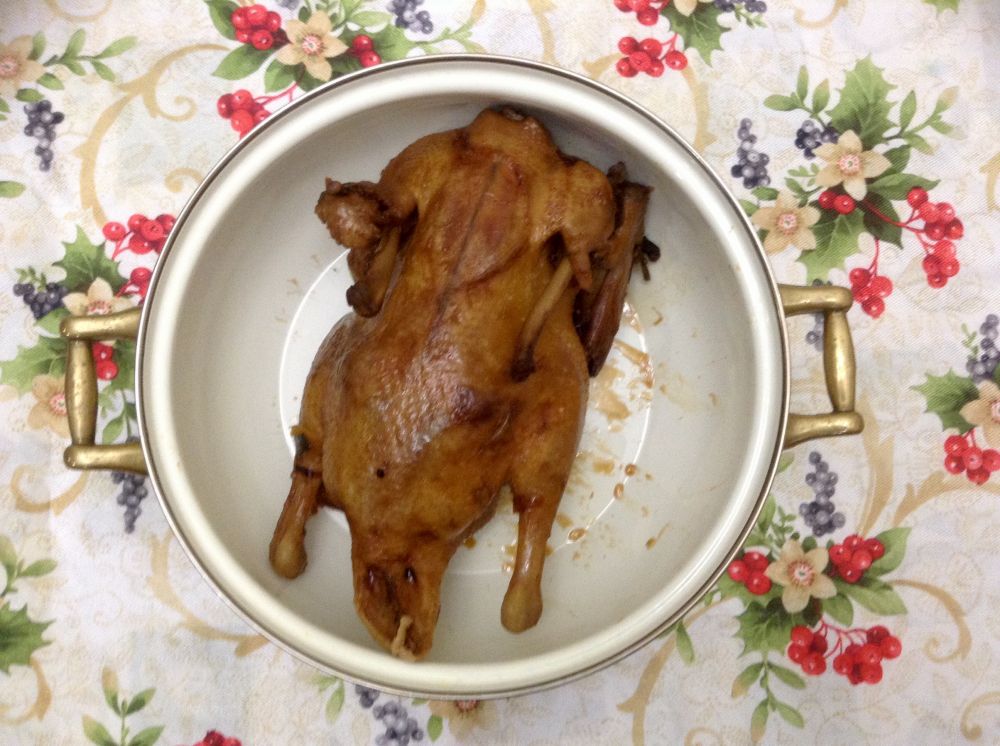 因为来自南京,每次聚餐,我家都会做一只盐水鸭;今年我想换个花样,就学做了文学城里美才女名博主菲儿传授的改良版的上海酱鸭,似乎还有模有样哈: