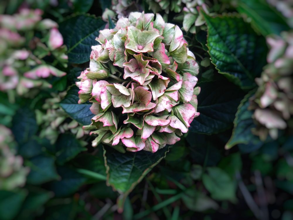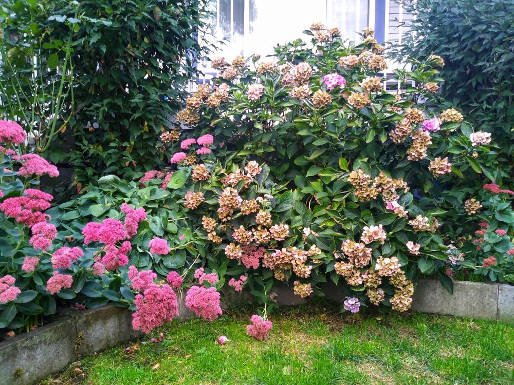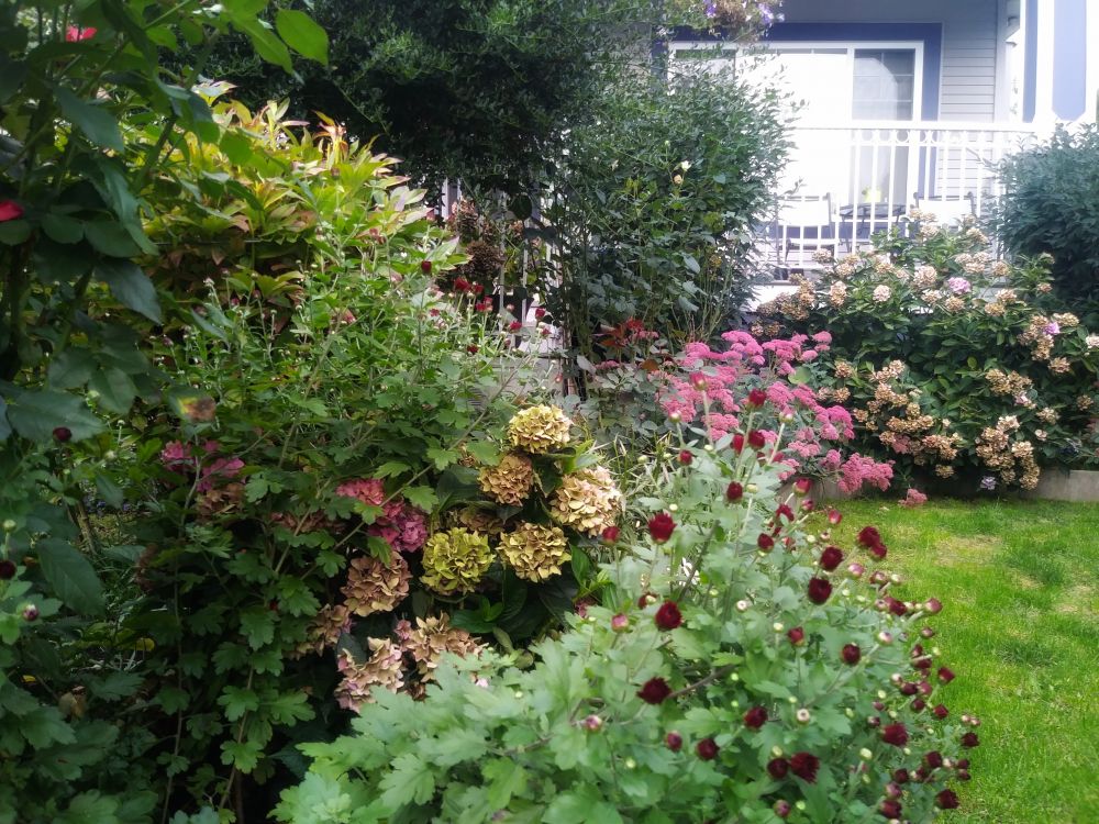 又下雨了! “秋阴不散霜飞晚,留得枯荷听雨声;温哥华有雨,我有一园子干枯的绣球花,且听雨吧……