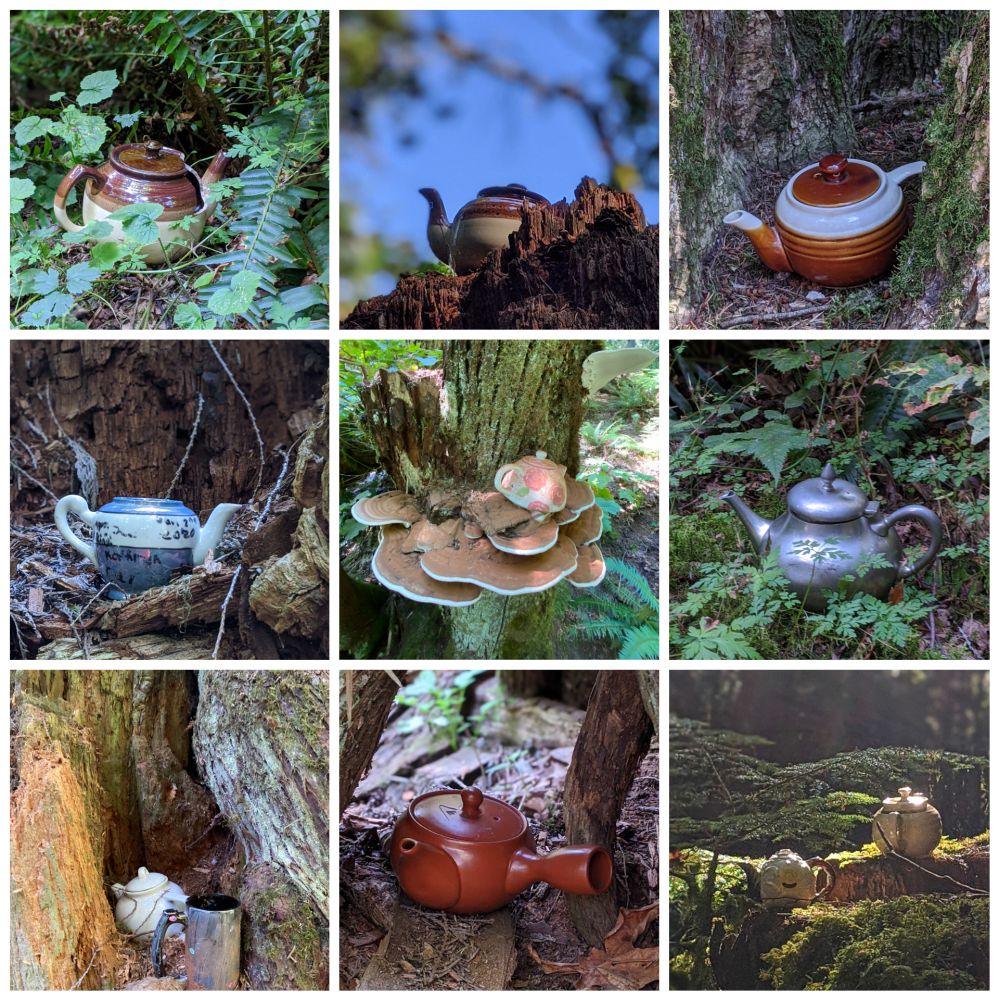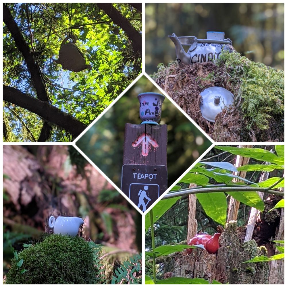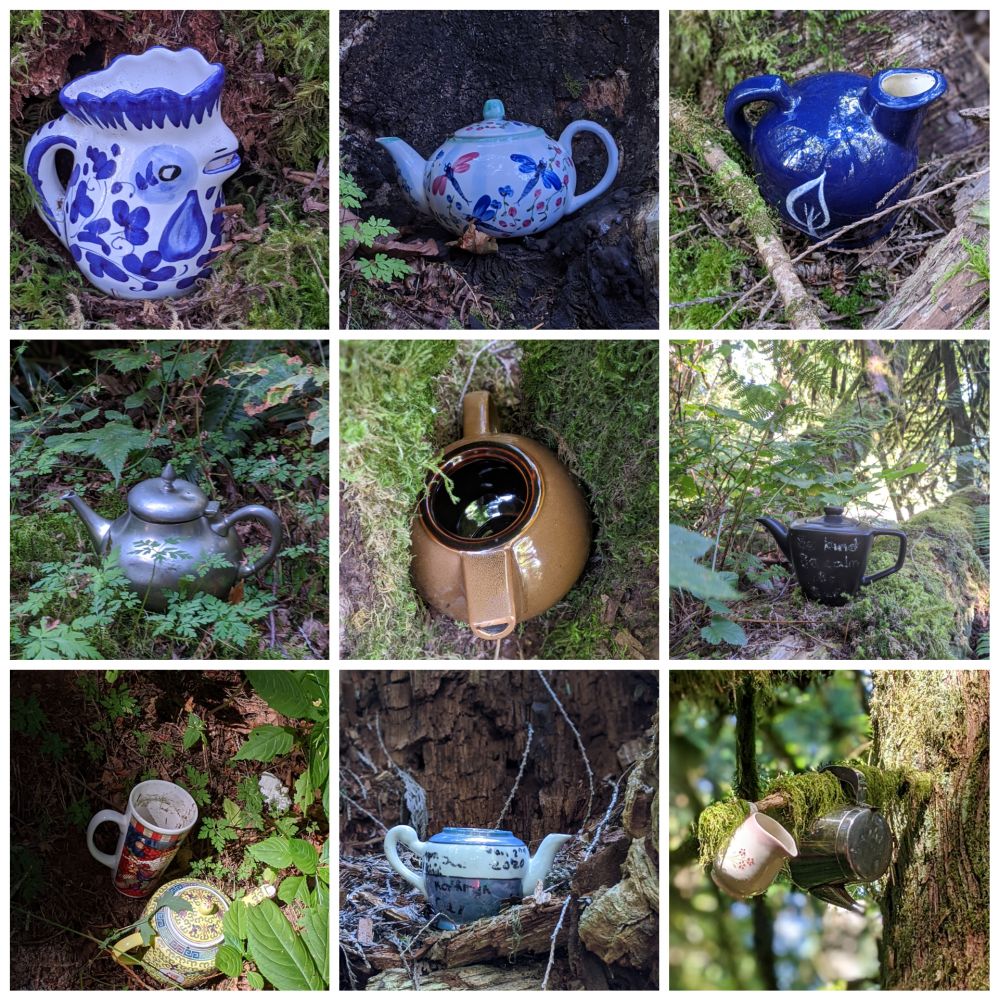 几年前第一次去茶壶山,看到树洞里、树墩上、或者树枝上藏着、摆着、挂着的茶壶时,觉得有点spooky!今天再去,感觉截然不同了!不但爬山找壶乐此不疲,而且自己也带了一把小壶,入山随俗,挂在树枝上了!