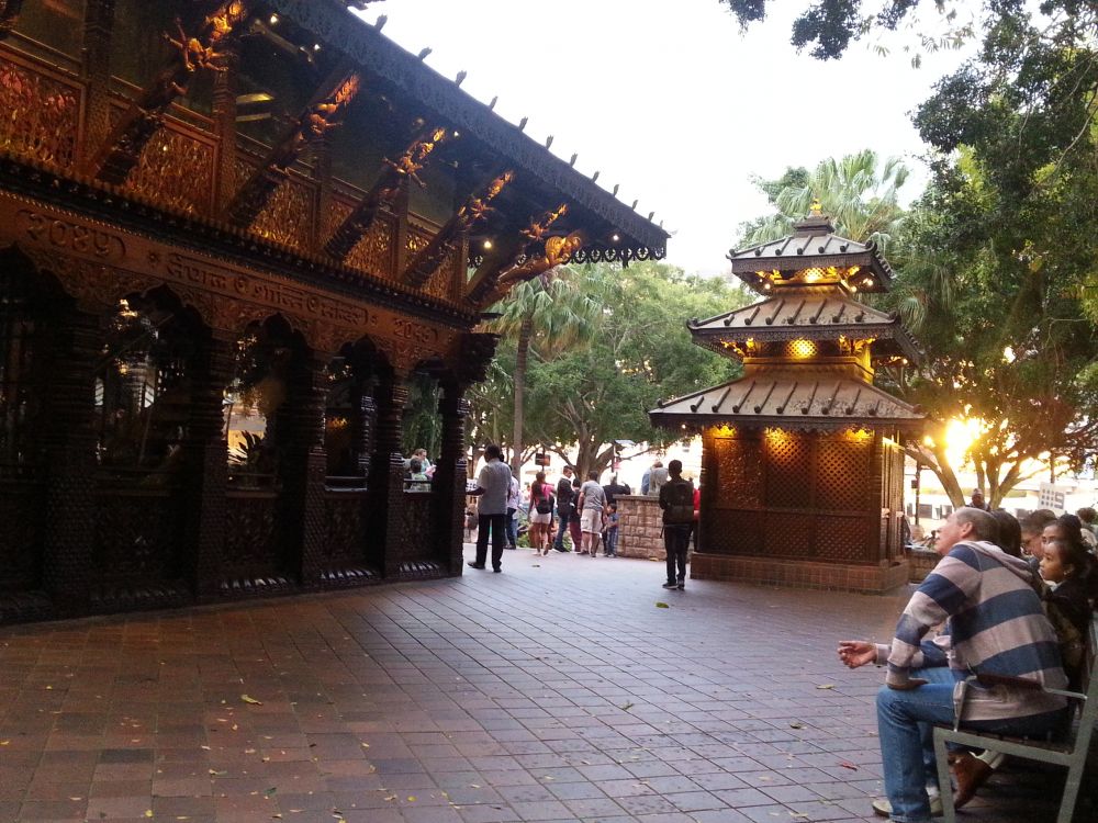 离施放烟花时间尚早,俺便坐在河边南岸公园那著名的尼泊尔寺庙里的长椅上休息。