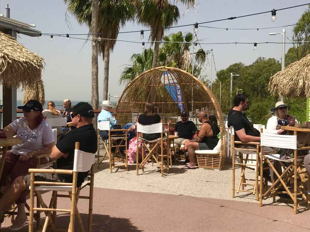 海边露天酒吧,顾客满座,三五知己面对大海把酒聊天。画面温馨浪漫舒心。给人感觉这里的人们轻松恬静而无忧无虑,一派祥和气氛。
